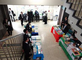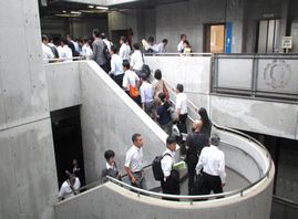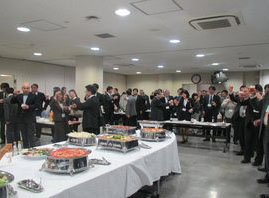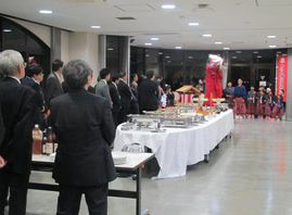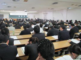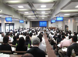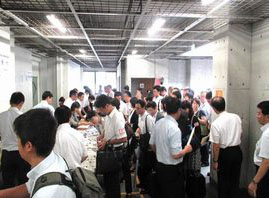 ![]() 全体会場前の受付に続く参会者の長蛇の列 |