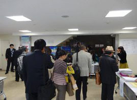 ![]() メイン会場外の別室にて映像の中継に見入る |